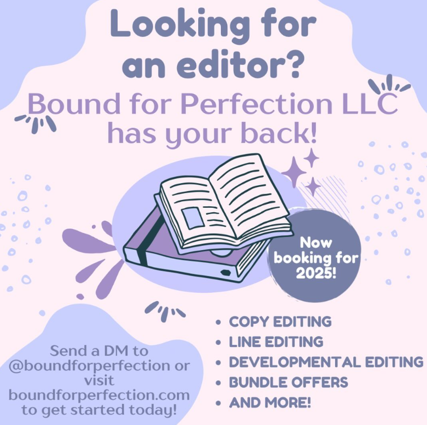 Professional editing with Bound for Perfection LLC is easy from start to finish. We offer developmental editing, line editing, copy editing, bundle deals, and more! Open to any genre and any word count.